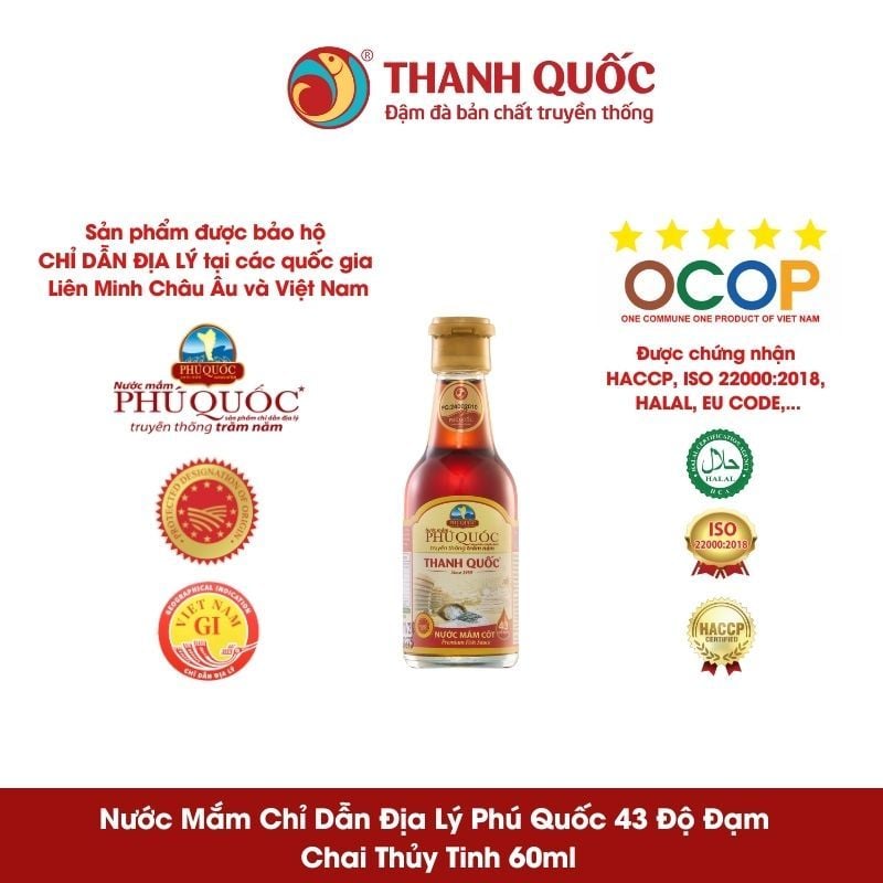 - Nước Mắm Chỉ Dẫn Địa Lý Phú Quốc - Thanh Quốc 43N là sản phẩm được bảo hộ Chỉ Dẫn Địa Lý Phú Quốc do Liên Minh Châu Âu cấp, sản xuất theo tiêu chuẩn HACCP, ISO 22000:2018 của Việt Nam