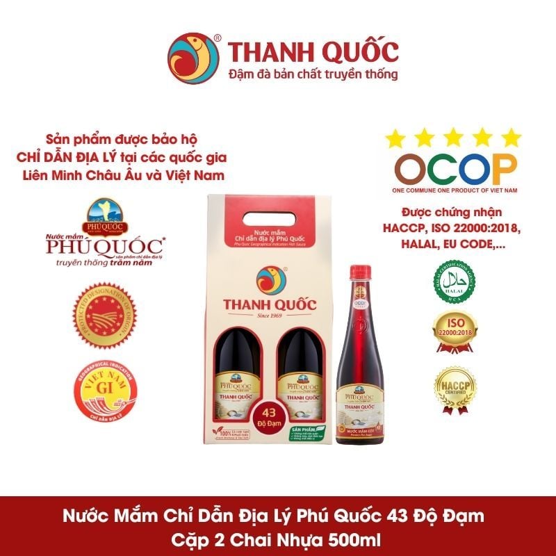 - Nước mắm chỉ dẫn địa lý Phú Quốc - Thanh Quốc 43 độ đạm là sản phẩm được Liên Minh Châu Âu và Việt Nam bảo hộ chỉ dẫn địa lý nguồn gốc xuất xứ “Phú Quốc”.